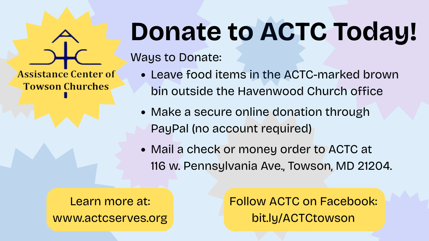 We support the Assistance Center of Towson Churches ecumenical programs that provides help to the poor and needy families in our community. Havenwood regularly participates in the annual school supply drive and supplies the food pantry.